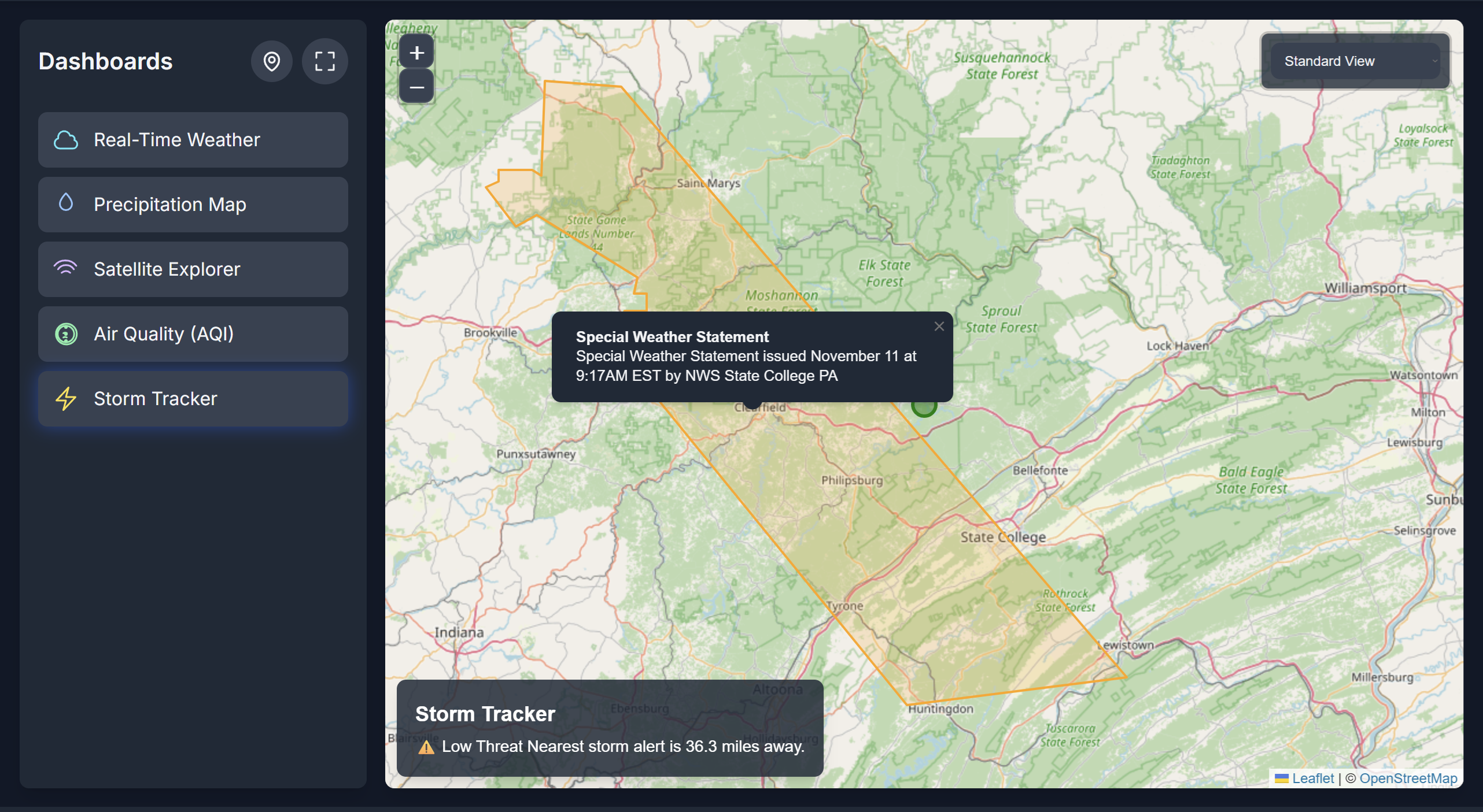 Storm Tracker: The National Weather Service GeoJSON feed is parsed into Leaflet layers, and a small Haversine helper estimates how close the nearest alert sits relative to the map center, translating distances into “no threat,” “low threat,” or “high alert” messaging.